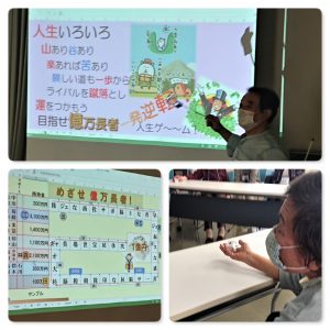 新しいメンバーも参加くださり、スタッフOさん考案の『令和式・人生ゲーム』をみんなで楽しみます。ボードゲームを今ふうにパソコンを使って競う、というもの。手製のサイコロを振ってコマを進めると、クイズが出たり、ジェスチャーをしたり。