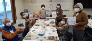 予定の1時間があっと言う間に過ぎて、きょうは「残業」をして仕上げることに。なんとか自分なりの「力作」が出来上がりました。最後に、みんなで記念写真を。我が家に持ち帰って、改めてきょうの「苦労」と「緊張」と「達成感」を味わうことにしましょう。お疲れさまでした!