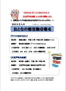 併せて、大豆戸町内会館でも毎月第一金曜日の午後1時から「おとなの部活動」大豆戸分会を継続します。5月度は5月6日(金)に「3A体操、切り絵細工」を予定しています。それぞれ、詳しくは下記ポスターをご覧ください。